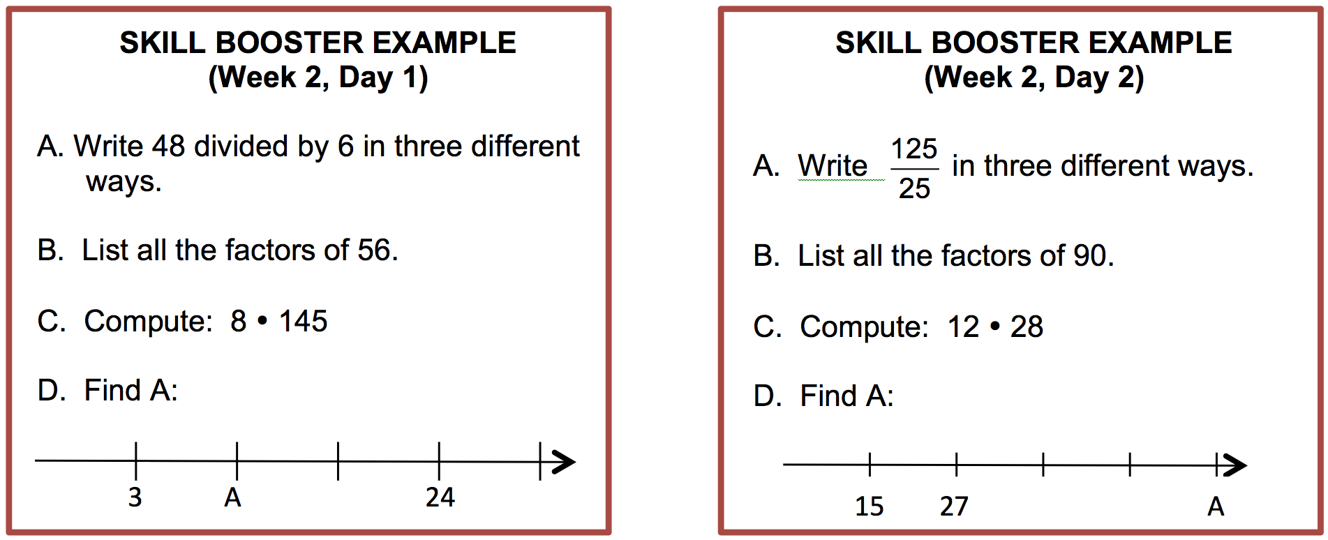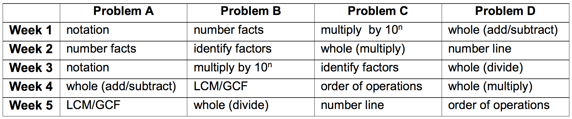 Illustrated here is a 5-week program that focuses on developing fluency with whole numbers. Students spend about 10 minutes per day on this work, as they complete four problems and review answers.